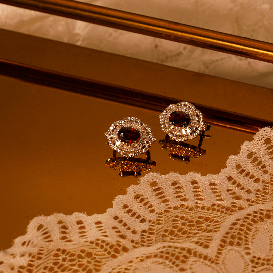 ✦ 石榴紅鋯石配以晶亮光圈,讓小巧耳釘也能折射迷人秋色,細緻中藏著柔和深意。✦
