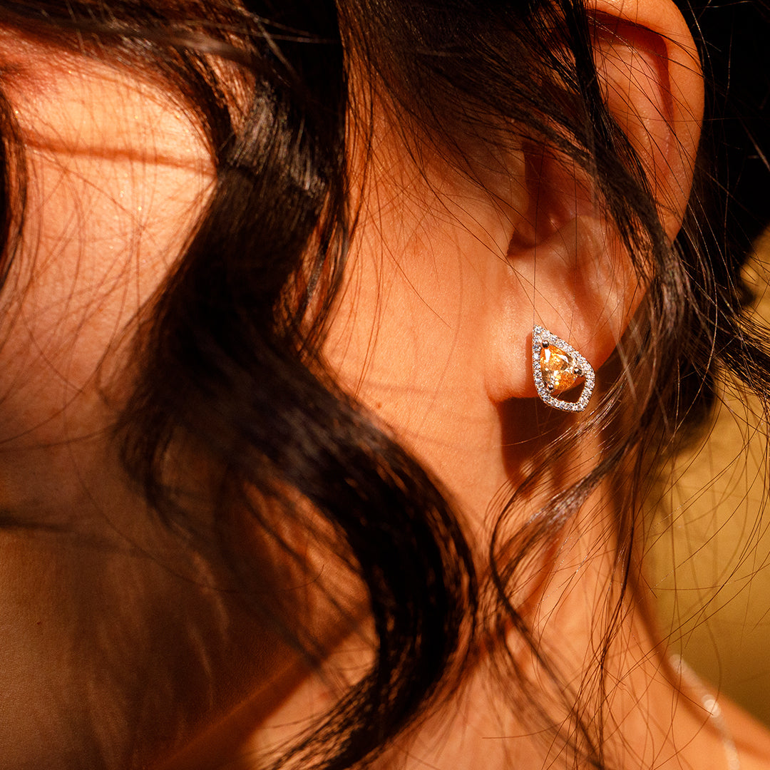 ✦ 香檳金鋯石點綴微墜弧形設計,像秋日午後斜陽灑落臉龐,帶著柔和又洗鍊的摩登光影。✦
