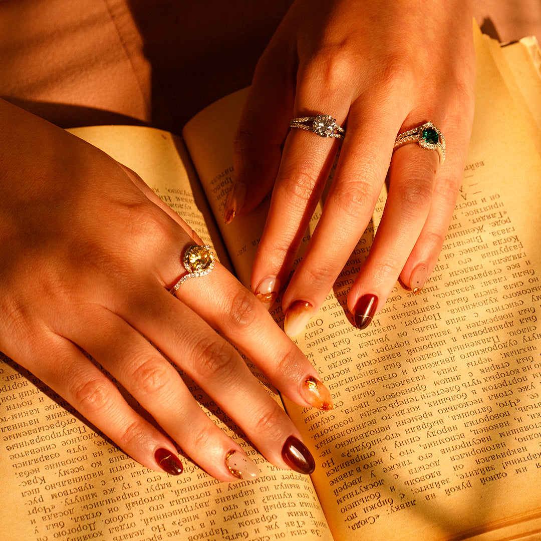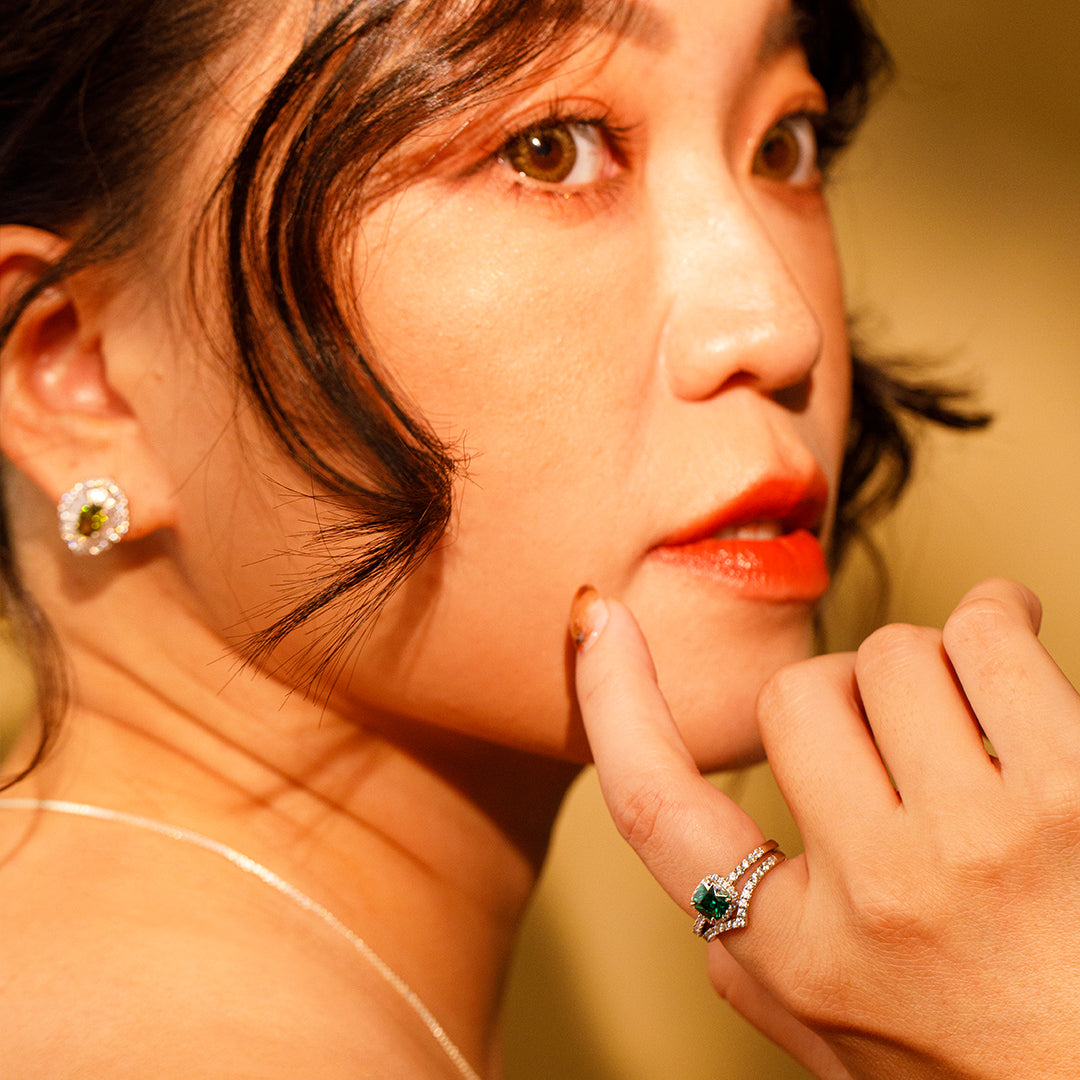 ✦ 綠鋯石為中心,環繞閃耀白鋯,營造層次光環感的造型,像秋日微光中的聚焦視線,靈動且具性格。✦