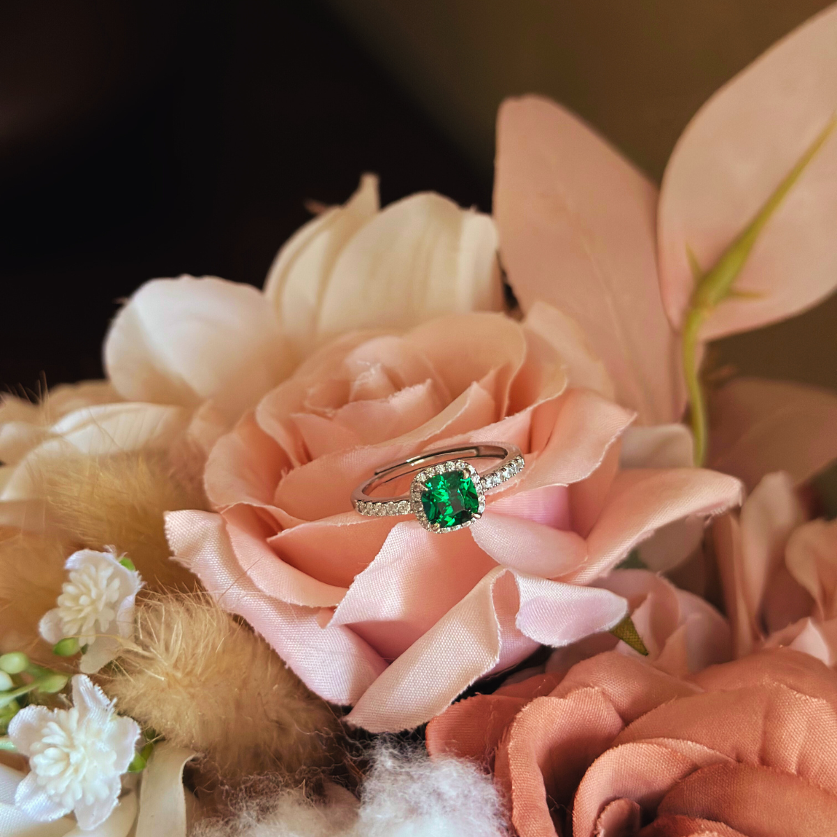 ✦ A vibrant green zircon is encircled by sparkling white stones – a modern halo design for fall layering.✦