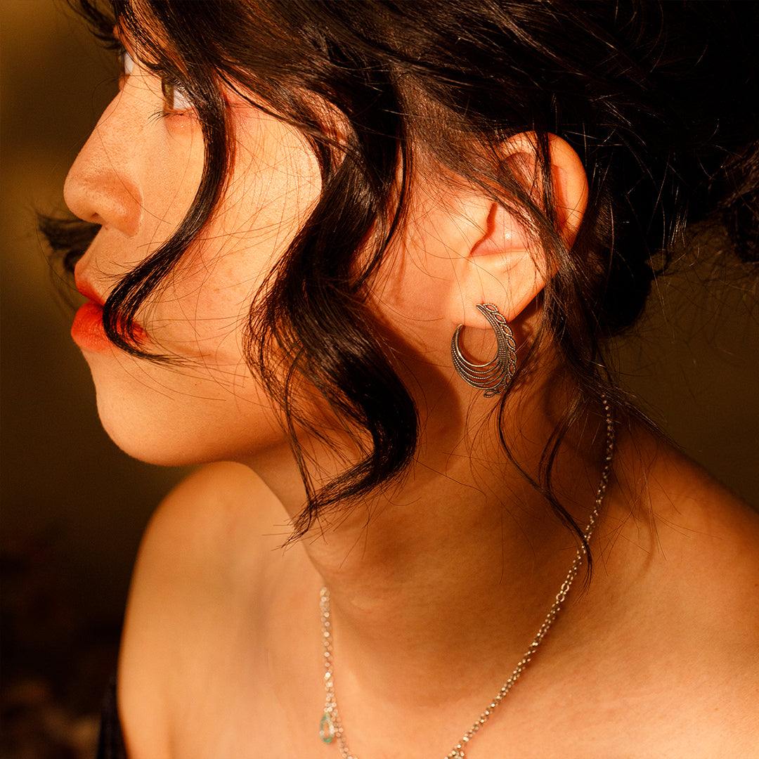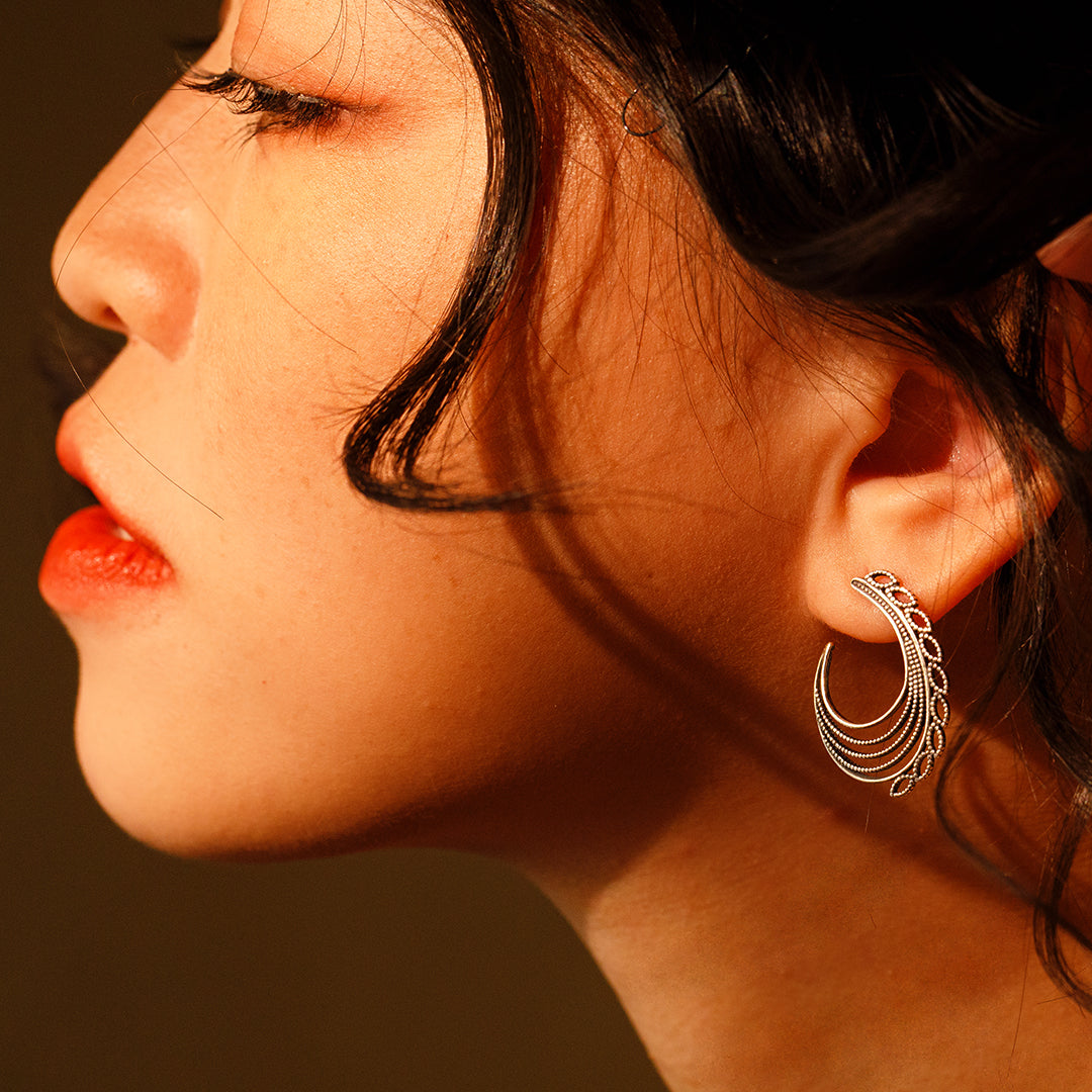✦ 弧形圓環似孔雀羽影展開,銀光流轉中蘊含靈動氣息,帶著異國華麗的耳邊詩篇。✦