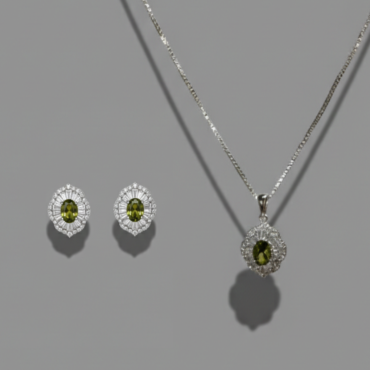 橄欖綠鋯為心,碎鑽環繞,搭配同系列耳環打造靜謐低語般的鎖骨光景。秋日裡的一抹沈穩魅力,悄悄閃爍。